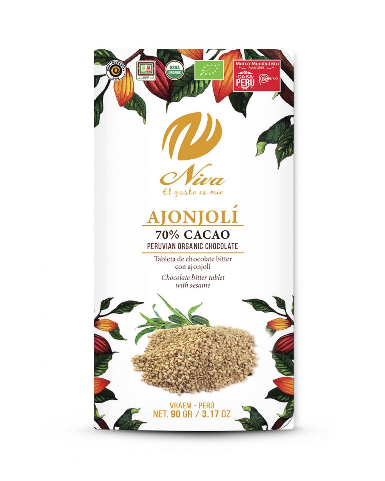 Chocolate bitter con ajonjolí de 90g - 70% cacao orgánico.